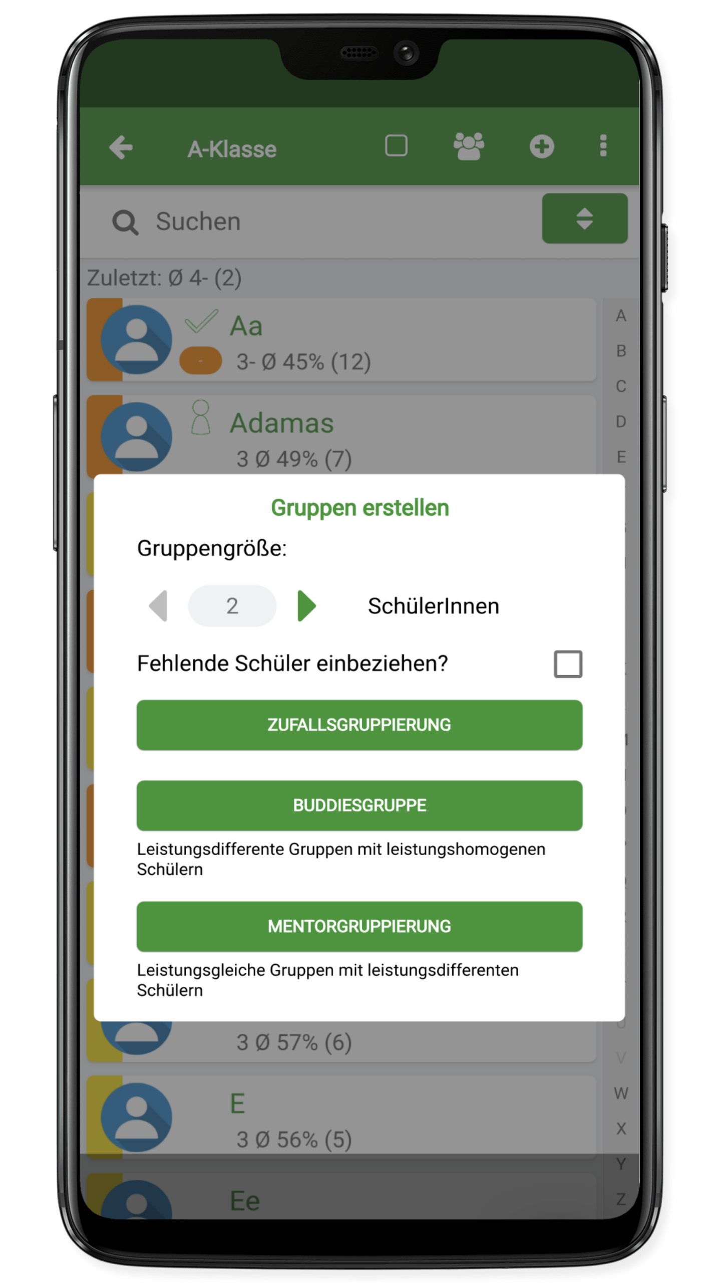 FlixGrade erstellt Gruppen beliebiger Größe. Dabei können leistungsdiffernte Schüler zu einer "Mentor-Gruppe" oder Schüler ähnlicher Leistung zu einer "Buddies-Gruppe" zusammengestellt werden. Natürlich kann man auch zufällige Gruppen erstellen.